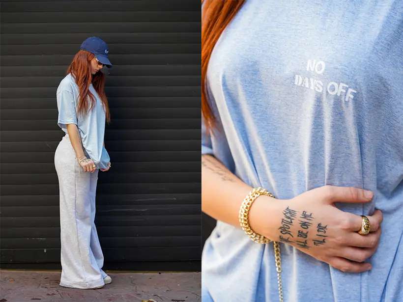 Şapka ve minimal takılar kombine kişisel bir dokunuş katar.